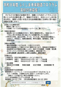 令和8年度ふくしま未来創造プログラム 支援元:福島県教育庁社会教育課 応募期間 事業1:2026年9月30日(水)17時必着 事業2:2026年5月15日(金)17時必着